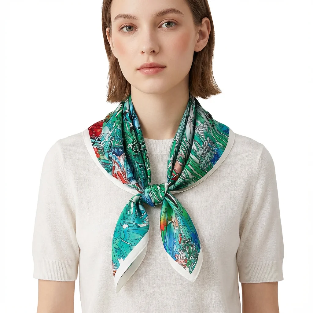 This silk scarf is made from premium mulberry silk and uses eco-friendly digital printing technology to ensure vibrant and long-lasting colors.